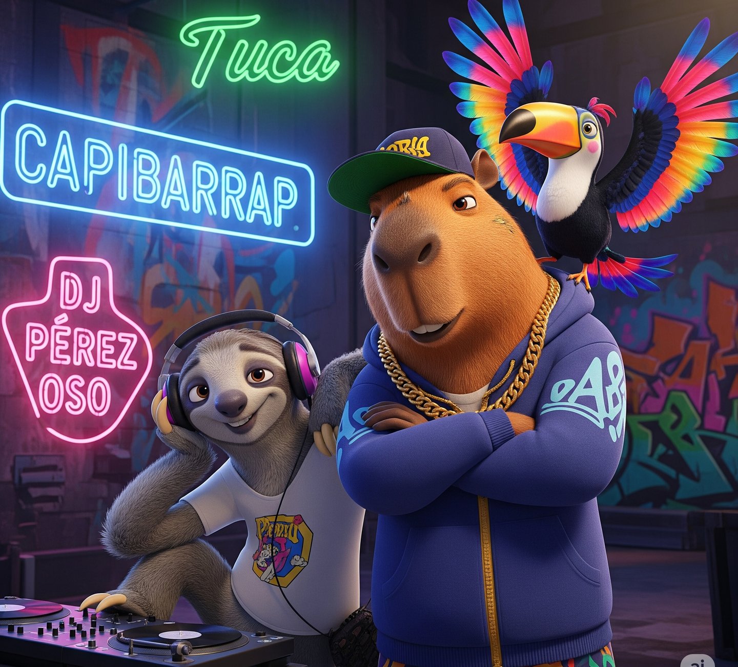 Los personajes son Capibarrap, DJ Pérez Oso y Tuca, amigos llenos de aventuras y música.